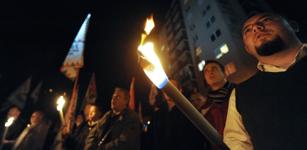 Simpatizantes de partido ultranacionalista húngaro realizam protesto em Miskolc, na Hungria, contra políticas do governo e contra a presença de população cigana no país