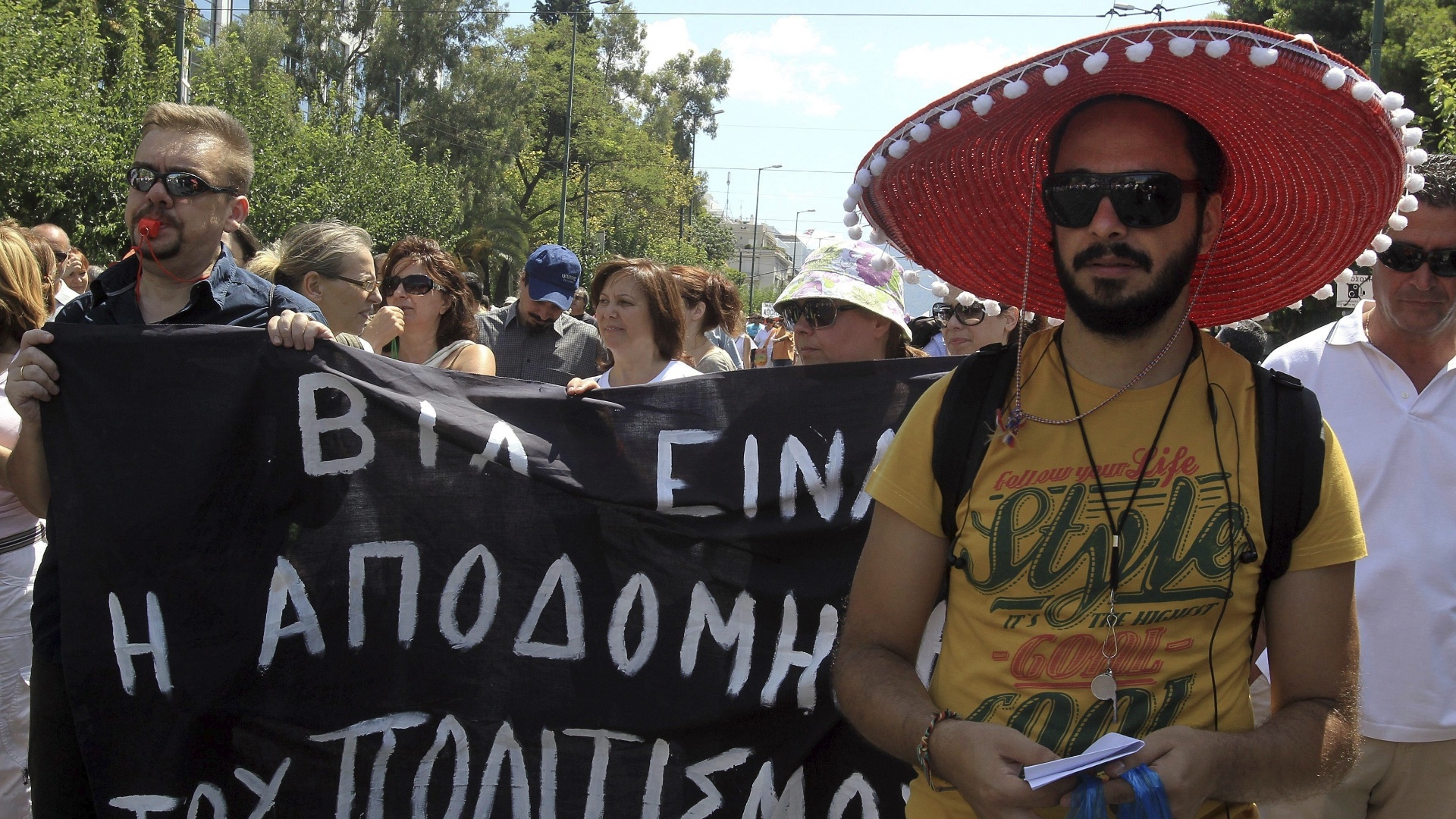 Gregos protestam contra plano do governo de reformar a administração pública, nas proximidades do Ministério da Reforma Administrativa, em Atenas, nesta sexta-feira