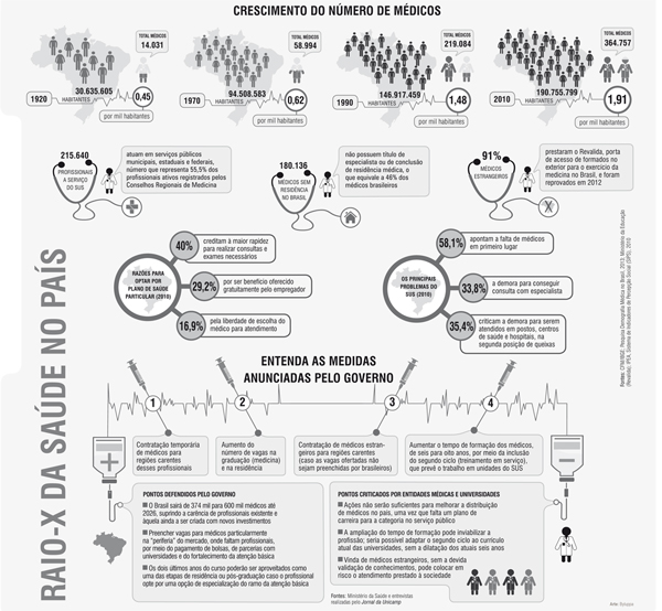 De 1970, quando existiam 58,9 mil médicos no país, o Brasil chegou a 2012 com um crescimento de mais de 500% na quantidade desses profissionais. No mesmo período, a população brasileira praticamente dobrou. Hoje, 55% deles, cerca de 215 mil médicos, atuam no Sistema Único de Saúde, segundo pesquisa do CFM. Em 2020, mantida a atual taxa de crescimento, existirão 500 mil médicos no país – média de 2,4 profissionais por mil habitantes, marca ainda inferior ao registrado, atualmente, na Argentina (3,2), no Reino Unido (2,7) e no Uruguai (3,7).